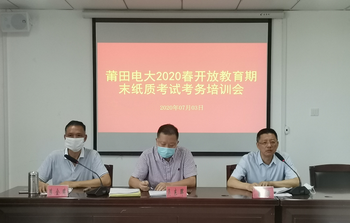 为保证疫情期间期末纸质考试工作的有序开展,7月3日下午,学校在办公楼6层会议室召开2020年春季期末考试培训会,党委副书记苏健、省电大巡视员吴东晖出席会议,考务人员及监考人员参加会议,教务处主任陈金瑞主持会议。