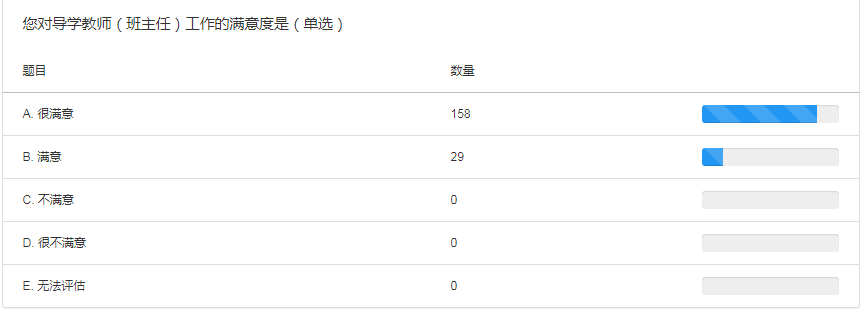 2、毕业生个人对莆田电大导学教师(班主任)工作评价高,很满意158人,满意29人。
