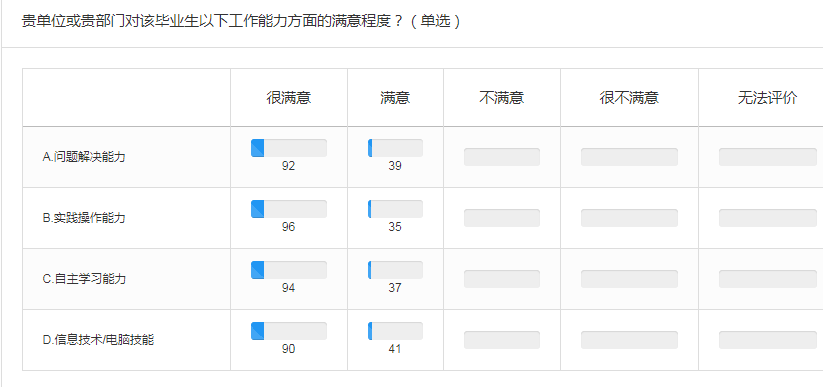 3、用人单位对毕业生评价高。用人单位对毕业生工作能力方面满意度为100%。