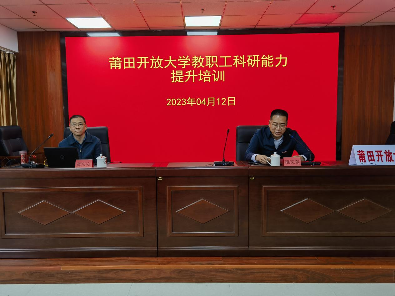 为了提升莆田开放大学内涵建设和服务能力,4月12日下午,莆田开放大学举行《提升莆田开放大学教师科研能力的途径》的讲座。讲座由莆田开放大学副校长凌文东主持,福建开放大学教学科研教处教授、管理学博士、科研处处长黄庆安主讲,莆田开放大学教职工30多人参加讲座。