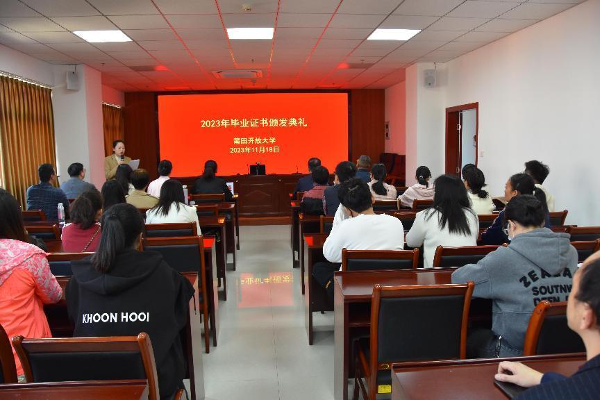 11月18日下午,莆田开放大学举行2023年毕业典礼暨学位授予仪式。莆田开放大学师生与全省各地市开大、教学点分会场一道通过收看线上直播方式参加活动,并现场举行别开生面的毕业典礼暨学位授予仪式。莆田开放大学校长李新洪、副书记苏健、全体辅导员、部分毕业生代表共50多人参加了活动。